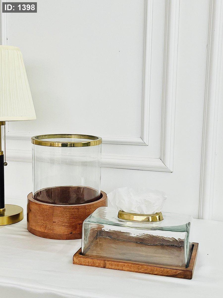 طقم سلة وعلبة محارم خشب وزجاج هندي