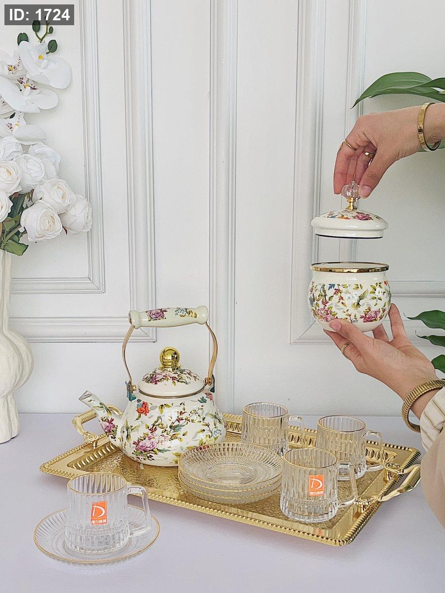 صنية + 12 الكاسة شاي وصحون + ابريق وسكرية
